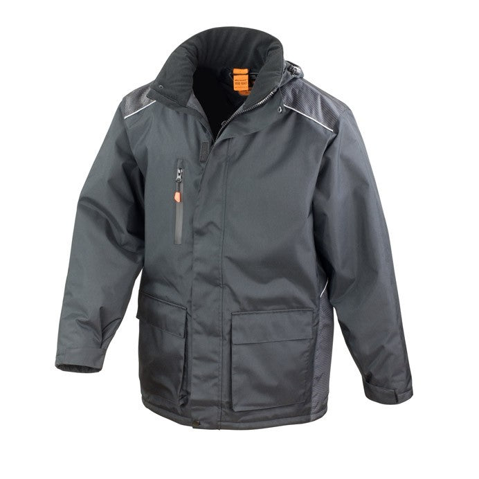 Full front heavy 2-way zip. Stud and tear release front storm flap. Zip-off adjustable hood. Adjustable shockcord hem. Front patch pockets with tear release close and side handwarmer entry, inside and outside chest pockets. Fully taped seams. Tear release external cuff with inner rib storm cuff. Reflective piping detail. Diamond quilted lining. Dobby design contrast panelling. Interchangeable pull system on all zips. Hangtag. Soft feel tricot lined collar.Decoration Guide:Decorating methods: Embroidery & Transfer print. Decorators access point: Inside left chest & lower back.
